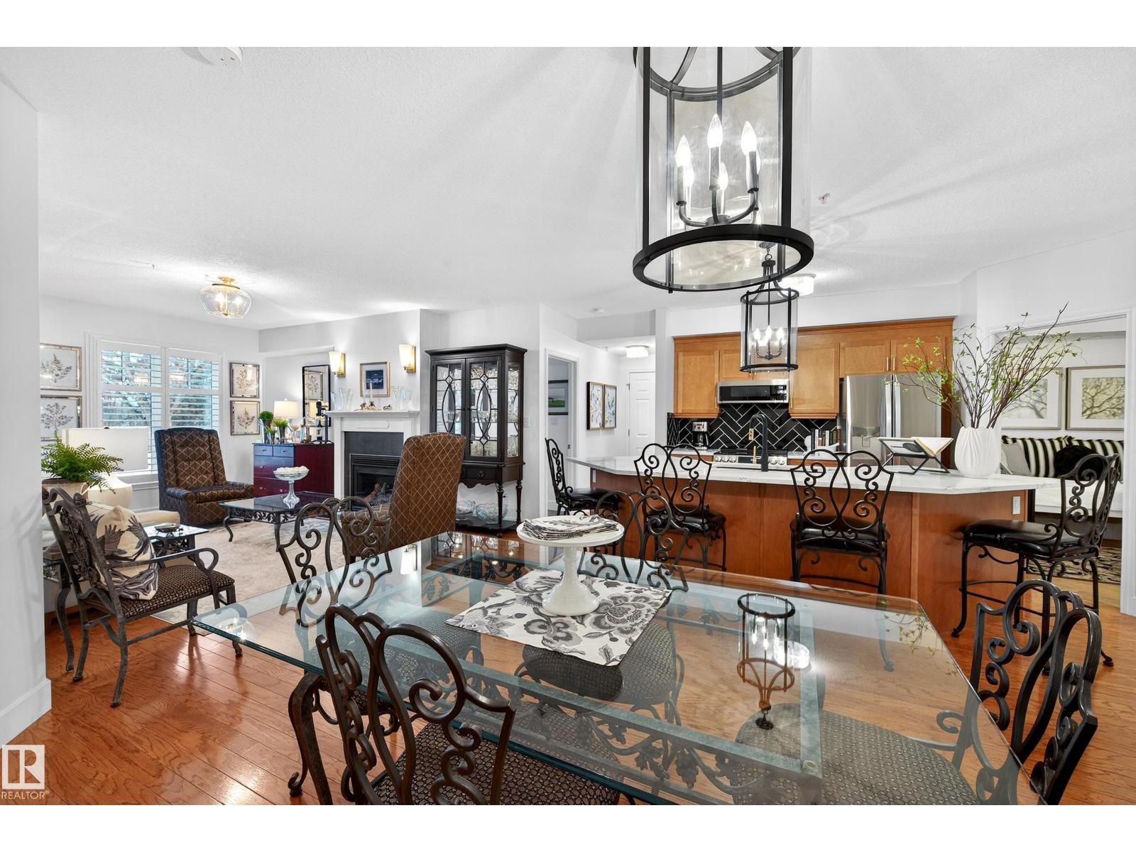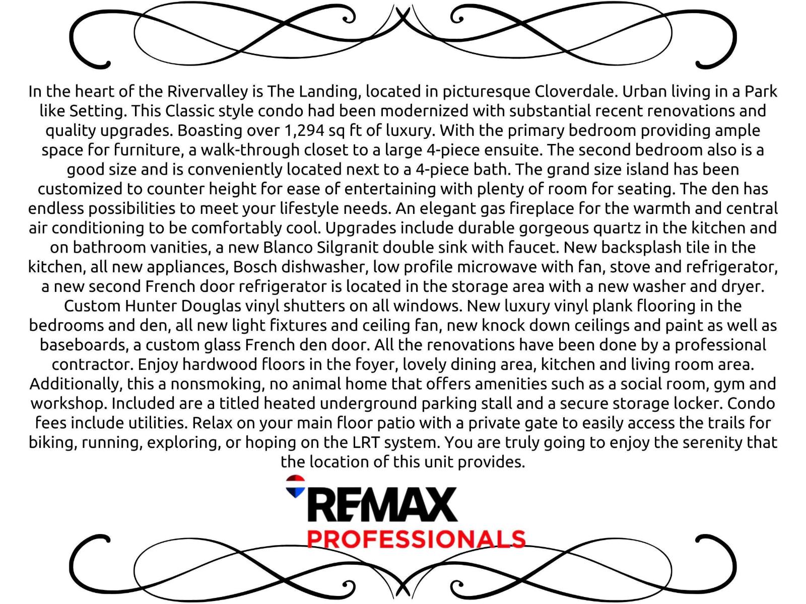 Located in the heart of the River Valley in Cloverdale. This beautifully renovated main floor condo features over 1,294 sq ft with quality upgrades throughout. The spacious primary includes a walk-through closet and 4-pc ensuite, 2nd bedroom is conveniently located next to another 4-pc bath. The updated kitchen is ideal for entertaining with a custom counter-height island, quartz countertops, new backsplash, Blanco Silgranit double sink, and all-new appliances. A versatile den with custom glass French door adds flexible living space. Enjoy hardwood flooring in the main areas, luxury vinyl plank in bedrooms & den, a gas fireplace, and central A/C. Additional upgrades include all new lighting, California knockdown ceilings, baseboards, Hunter Douglas shutters, new washer, dryer. This non-smoking, no-pet home includes titled heated underground parking, secure storage, amenities, condo fees including utilities, & private main-floor patio. Easy access for trails, river valley parks and LRT. (id:42720)