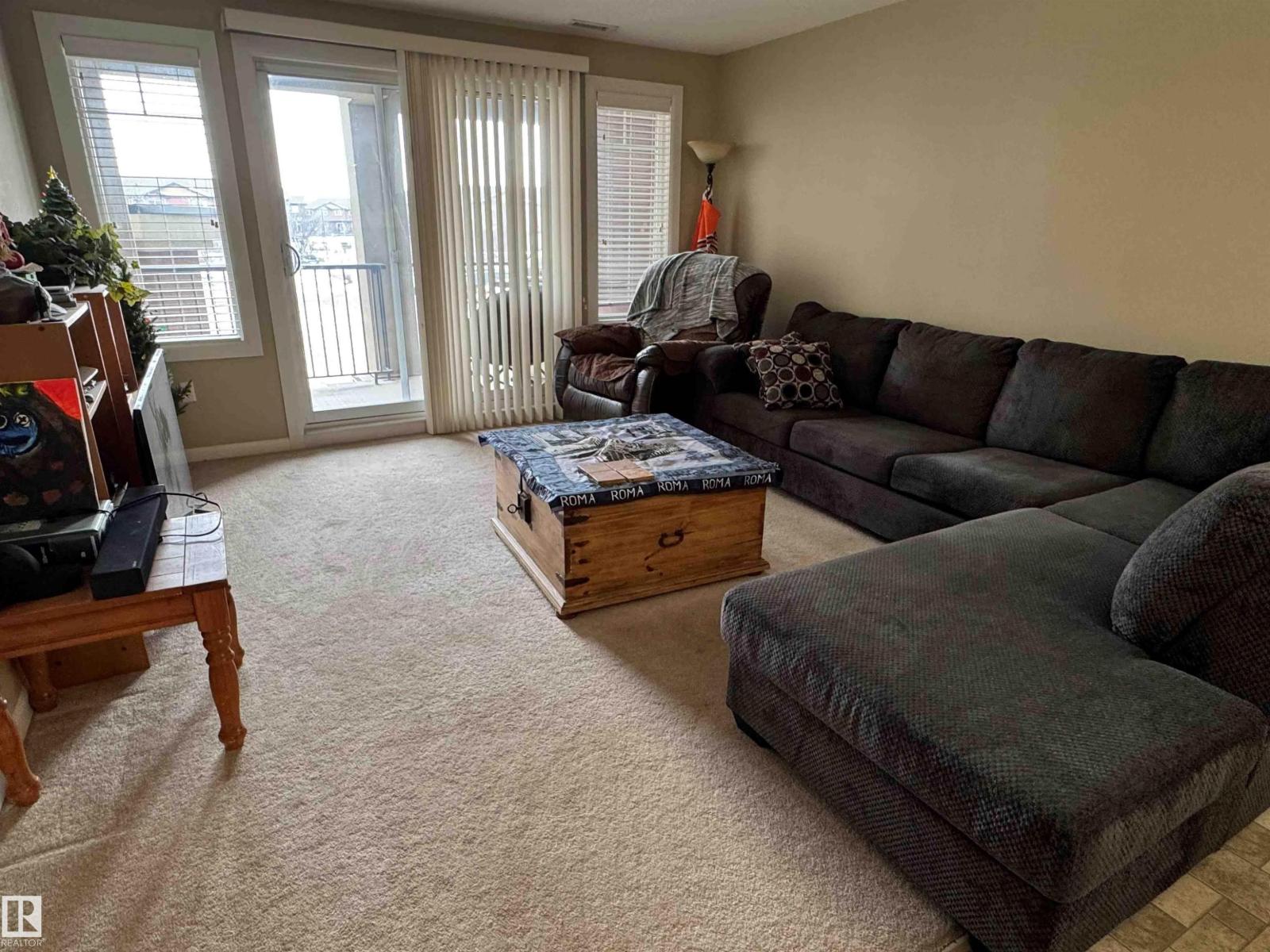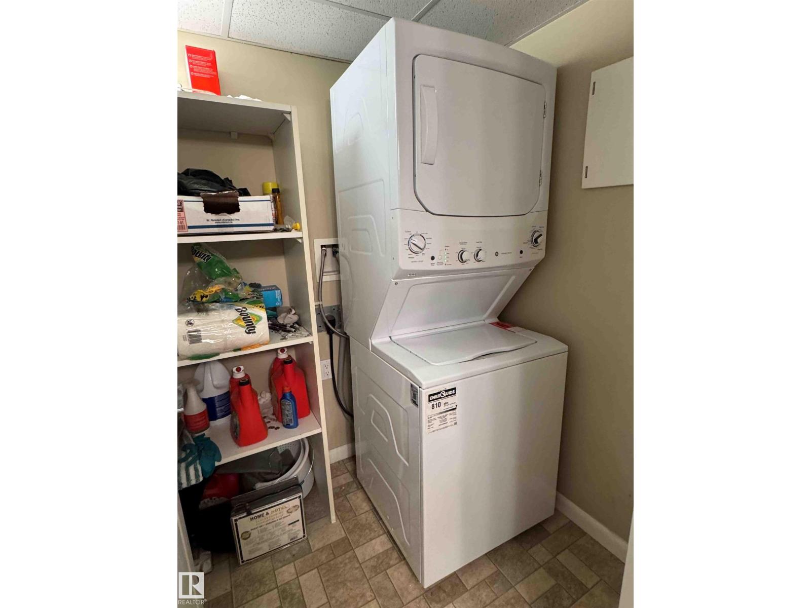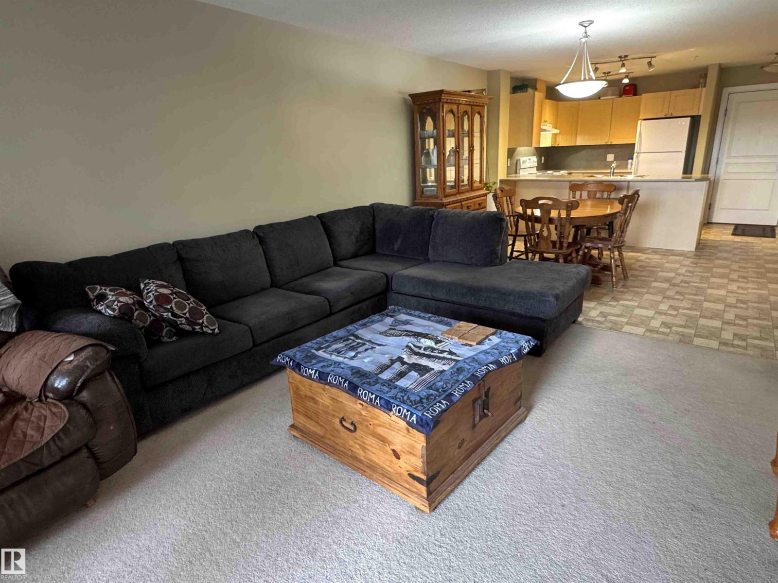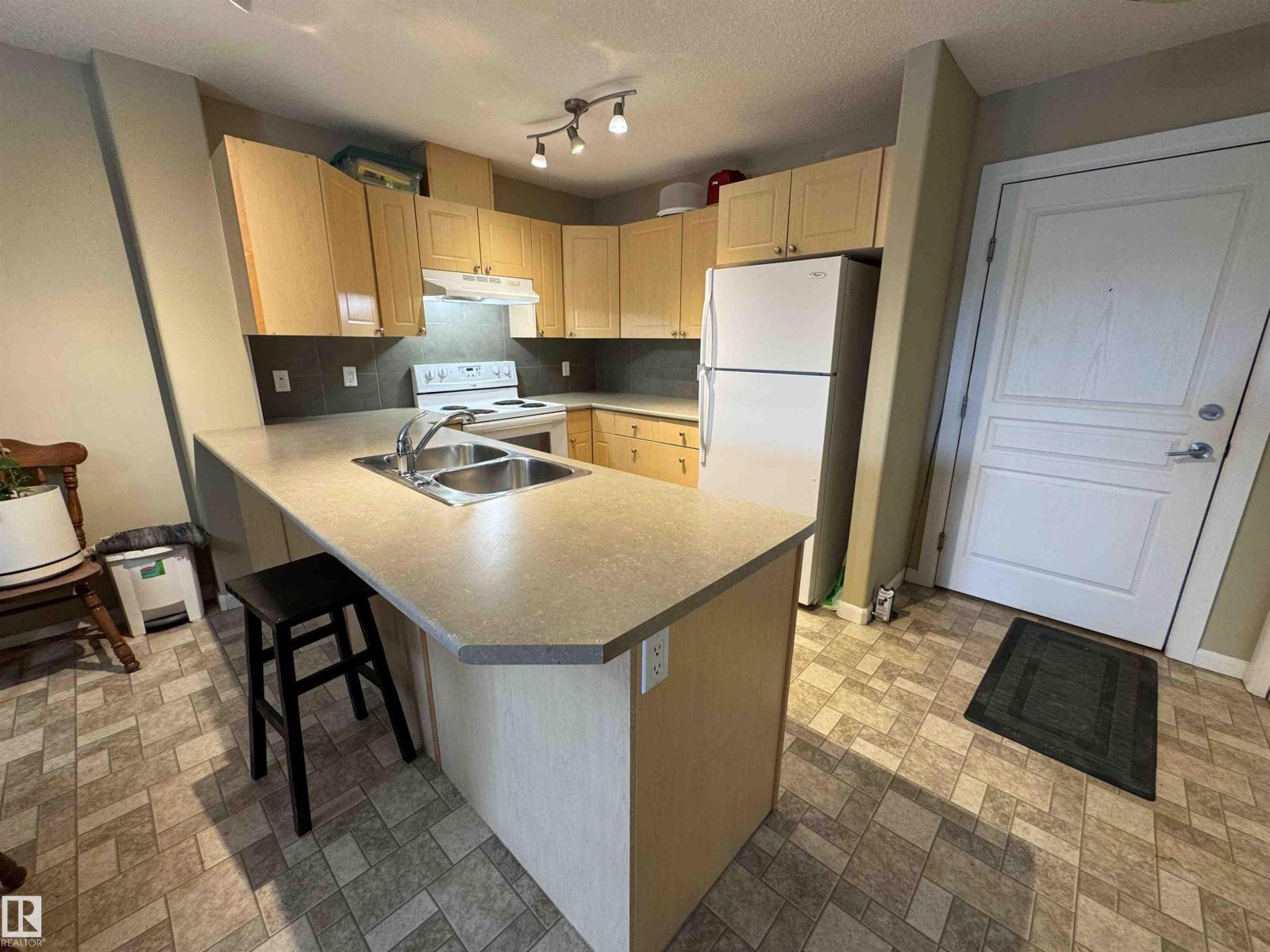 Amazing location in Sherwood Park! This second-floor unit in the sought-after Palisades (300 building) offers 1 bedroom plus den in a well-maintained 18+ complex. The modern open-concept layout features a U-shaped kitchen with eat-up bar and ample counter space, flowing into the dining and living areas. The primary bedroom includes a walk-in closet with direct access to the full 4-piece bath. Enjoy the convenience of in-suite laundry with stacking washer/dryer and additional in-suite storage. The versatile den is ideal for a home office or exercise space. Fan coil system replaced in 2021 providing both A/C and heat. Includes one titled heated underground parking stall with caged storage (Stall 141). Exceptional amenities include car wash, gym with steam & sauna, social room with pool table, and theatre room. Close to transit, parks, rec center, shopping, and easy access to Hwy 16. (id:42720)