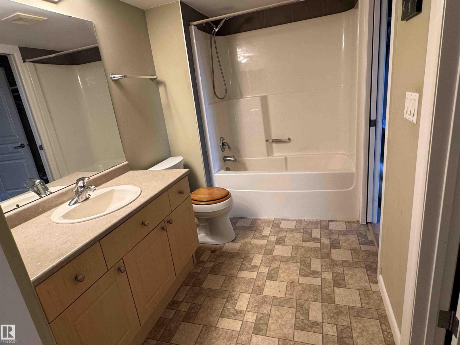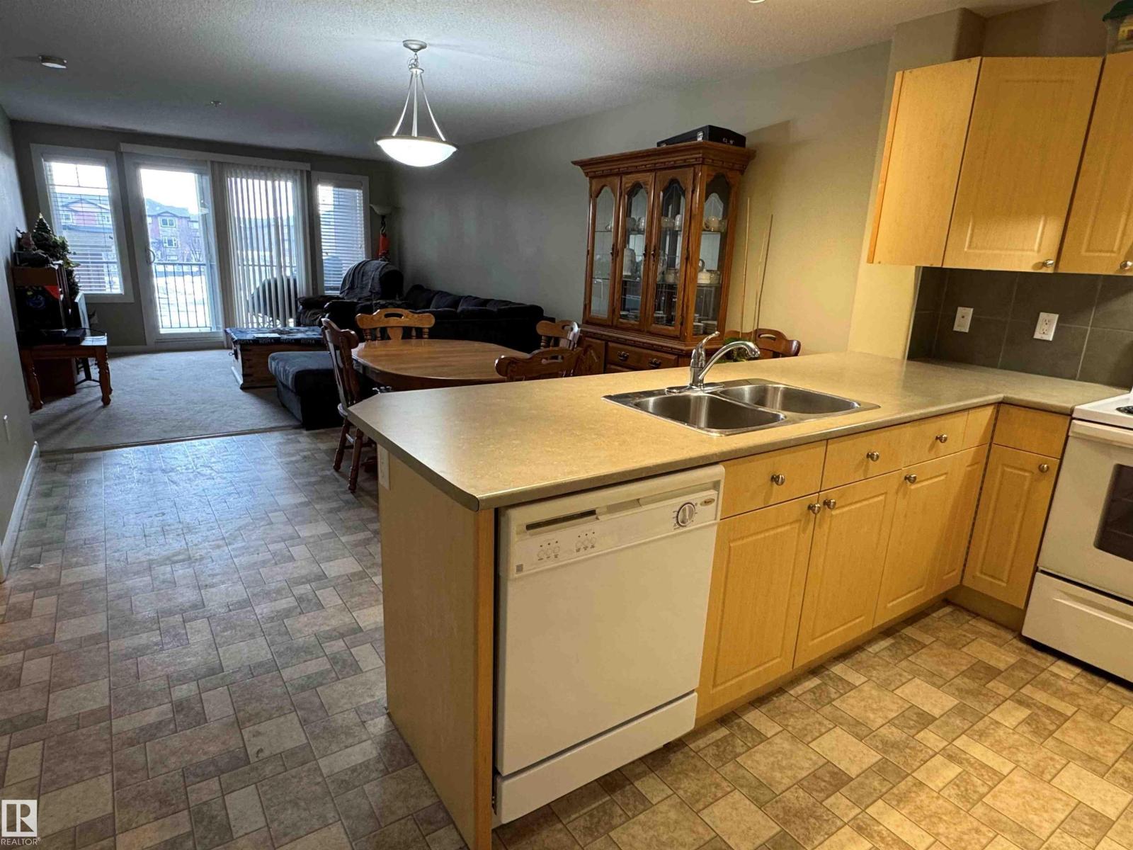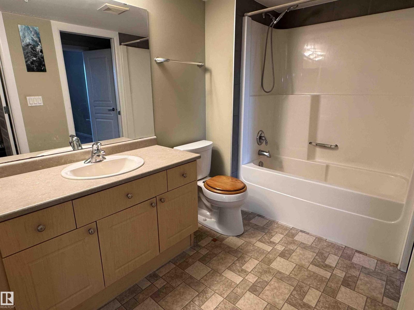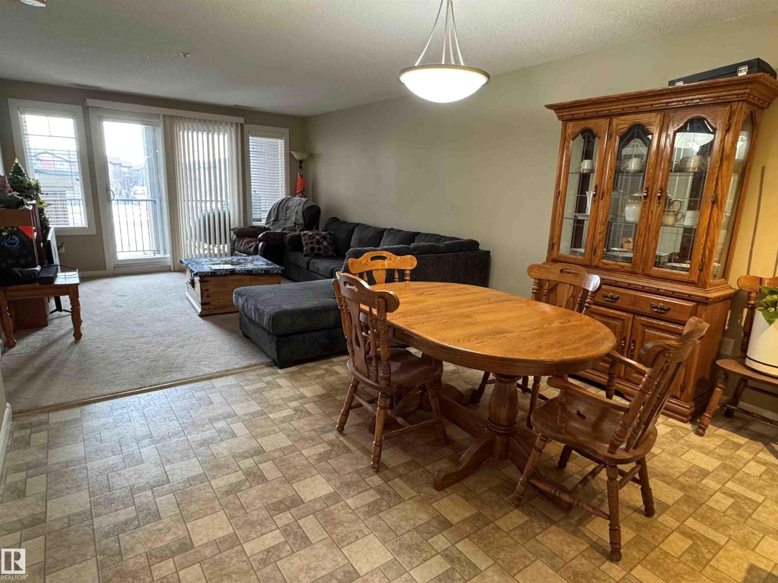 Amazing location in Sherwood Park! This second-floor unit in the sought-after Palisades (300 building) offers 1 bedroom plus den in a well-maintained 18+ complex. The modern open-concept layout features a U-shaped kitchen with eat-up bar and ample counter space, flowing into the dining and living areas. The primary bedroom includes a walk-in closet with direct access to the full 4-piece bath. Enjoy the convenience of in-suite laundry with stacking washer/dryer and additional in-suite storage. The versatile den is ideal for a home office or exercise space. Fan coil system replaced in 2021 providing both A/C and heat. Includes one titled heated underground parking stall with caged storage (Stall 141). Exceptional amenities include car wash, gym with steam & sauna, social room with pool table, and theatre room. Close to transit, parks, rec center, shopping, and easy access to Hwy 16. (id:42720)