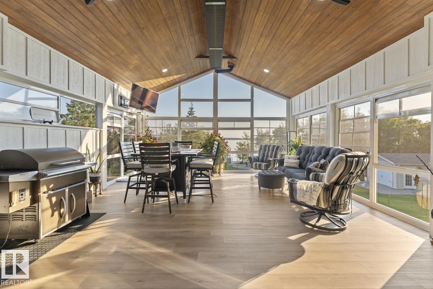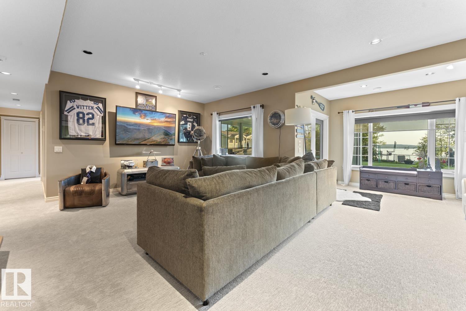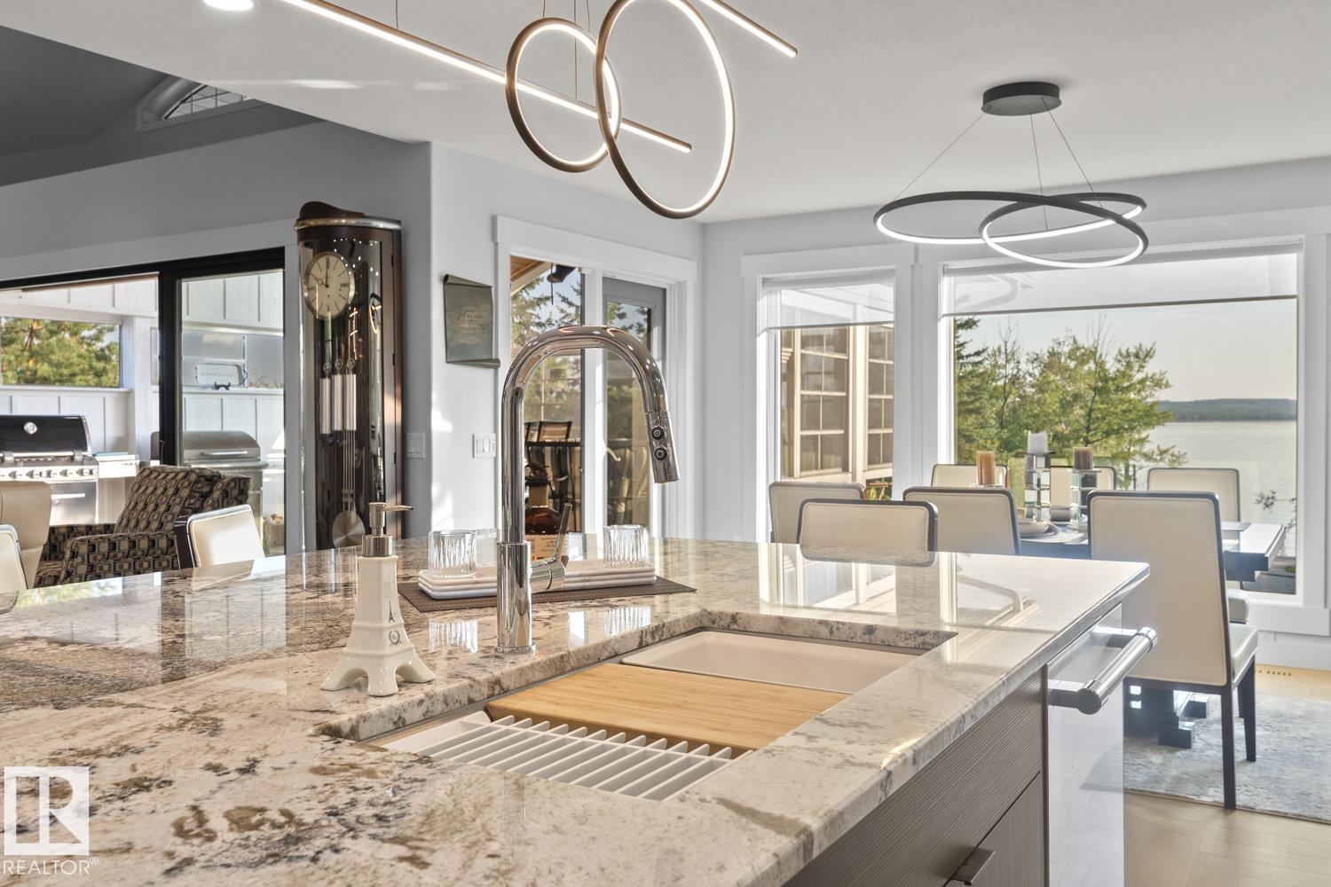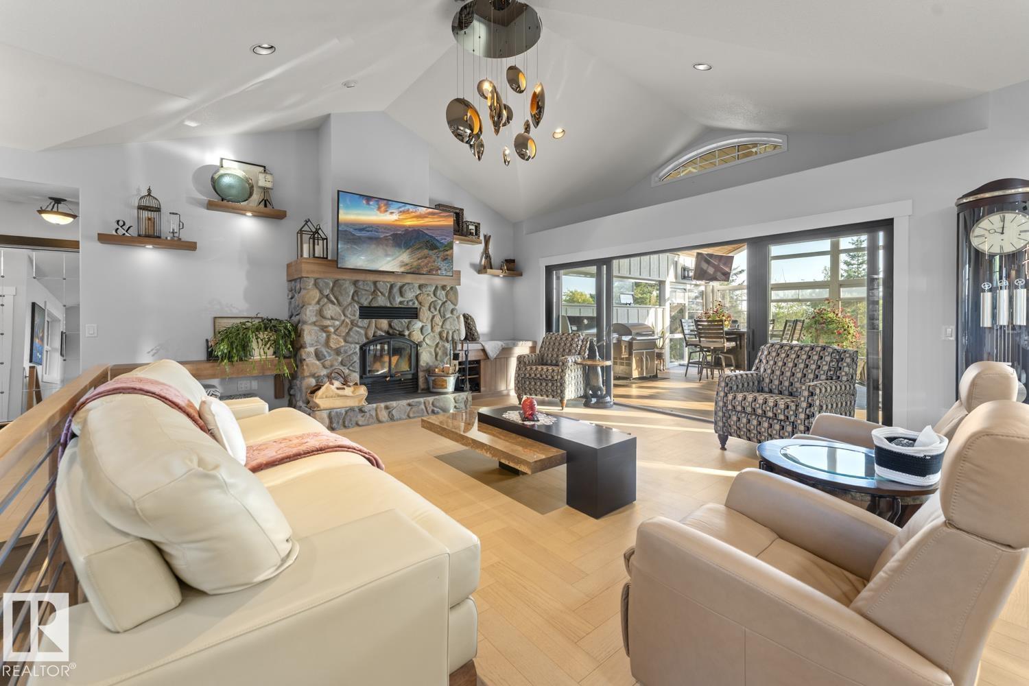 Lakefront Masterpiece of Design. Extensively modernized & expanded, this bungalow in Chateau Estates- Moose Lake features custom finishings throughout. Inviting porch opens to an open-concept layout w/ vaulted ceilings. Living rm showcases hardwood floors & wood f/p. State-of-the-art kitchen boasts built-ins, hi-end appliances, huge eat-at island & extras galore. 4-season sunrm w/ gas BBQ hookups & ventilation. 4 beds, 3 baths incl. luxurious primary suite w/ 5pc ensuite including dbl sinks, huge tiled shower, freestanding tub w/ electric f/p, spacious closet & heated floors. Main flr laundry, A/C, central vac & surround sound. Fully dev’d walkout bsmt w/ rec rm, wet bar, flex rm, wine cellar, storage, underslab heat & screened patio. Beautifully landscaped yard w/ mature trees, circular drive, fountain, fenced yard, 2 sheds, lakeside firepit, UG sprinklers & no-maintenance deck. Heated att’d dbl garage + 30'x60' heated shop w/ 220 power,3pc bath & mezz. Close to town, golf course & parks. Live the Dream! (id:42720)