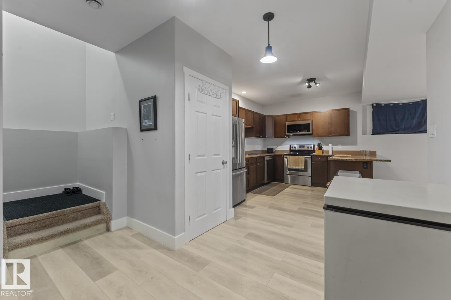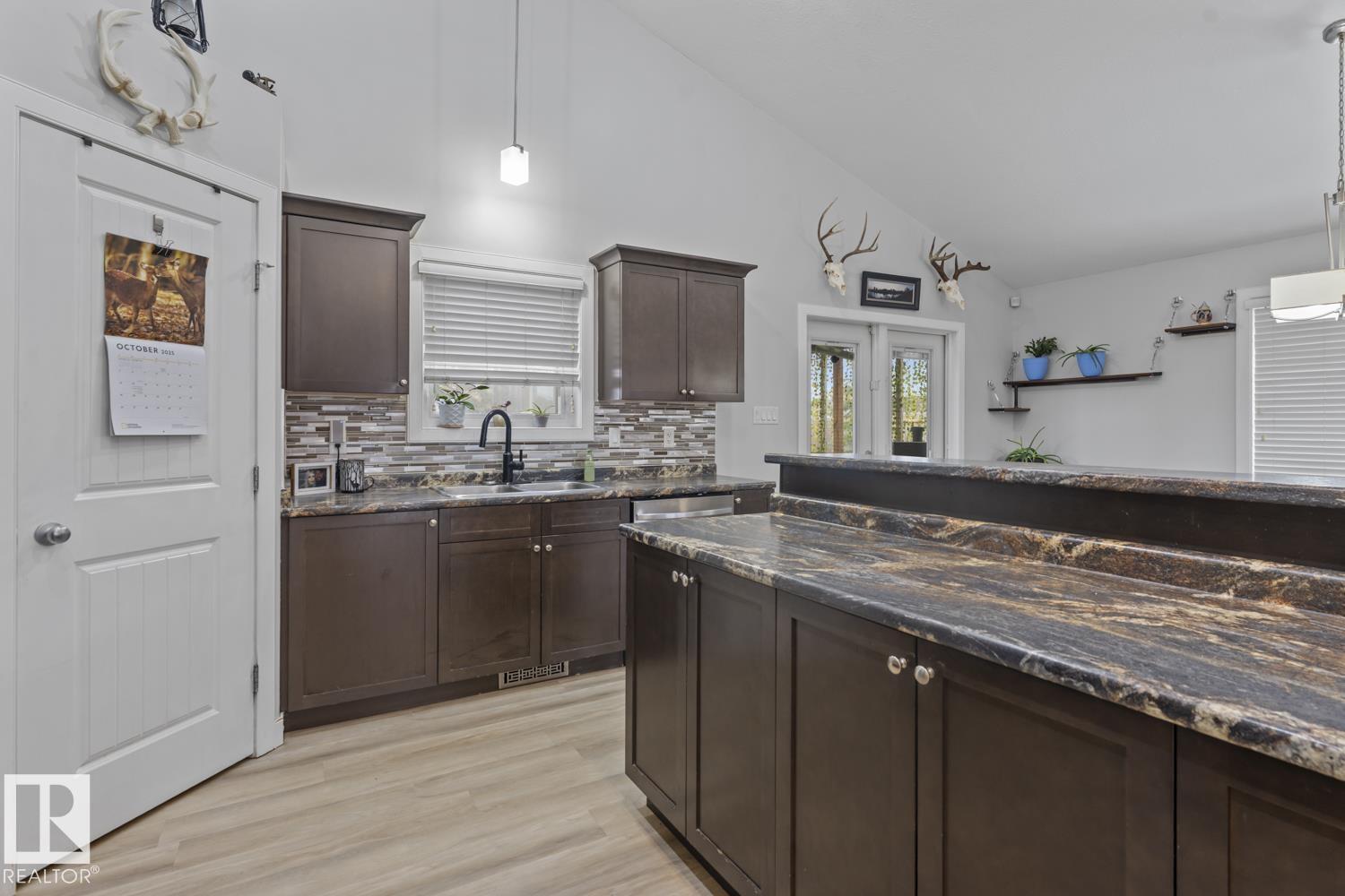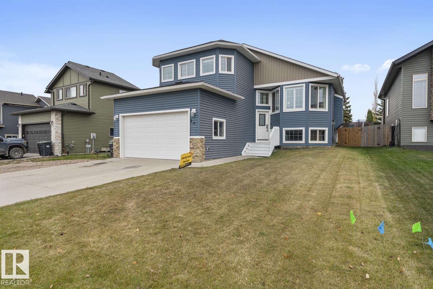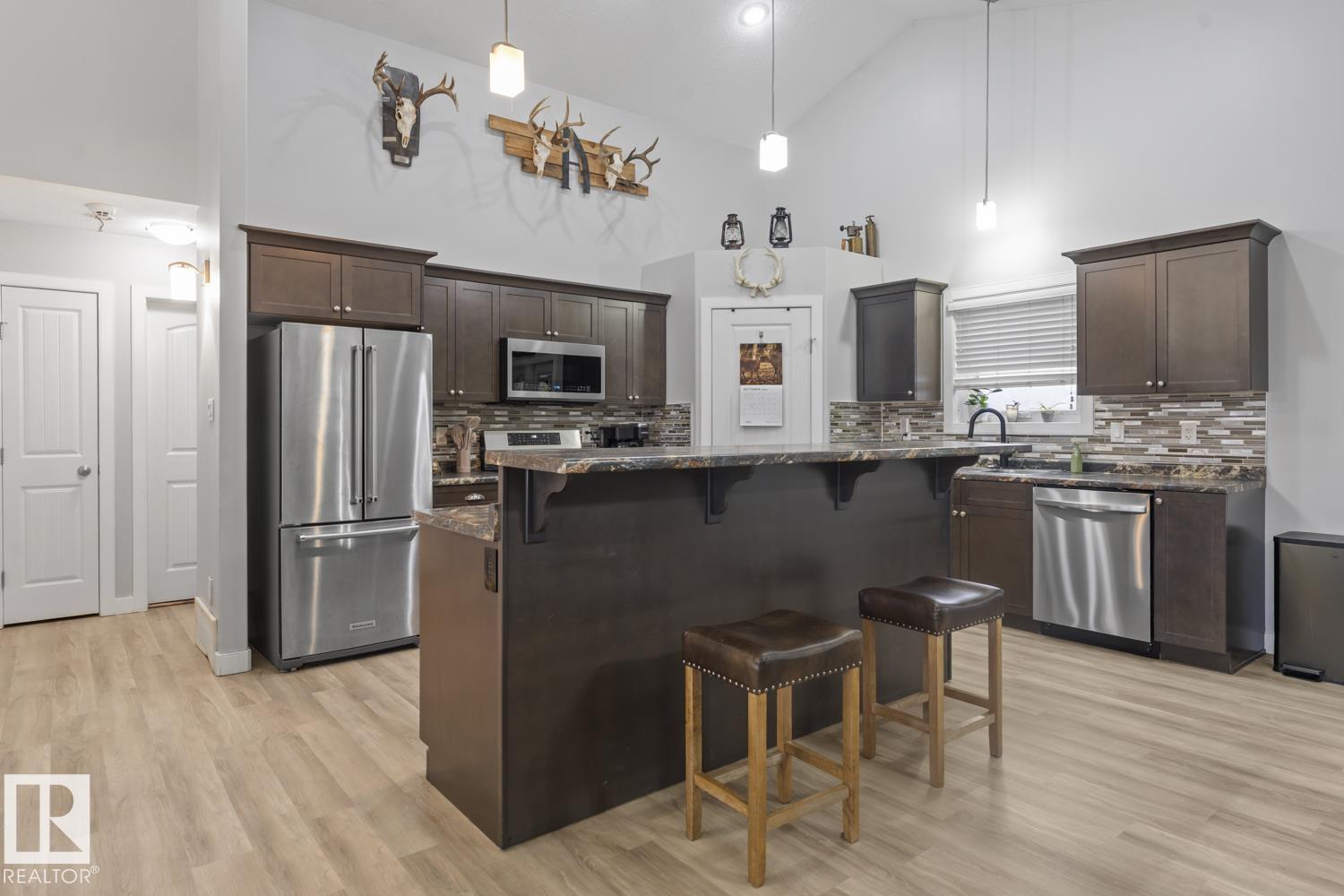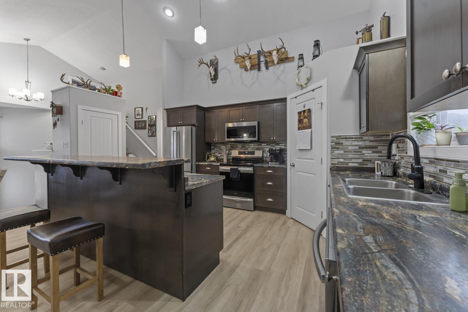 Modern feel Hailey style home with 3 bedrooms & garage access off the top 2 levels PLUS AN IN-LAW SUITE IN BASEMENT( with separate entry, full kitchen + laundry!) ASPEN RIDGE, a family friendly subdivision! Open concept with vaulted ceilings! Main level with new flooring. Large windows through-out this home! Livingroom with gas fireplace, spacious dining area with patio doors leading to a covered back deck! Kitchen with dark cabinetry, pantry, all appliances included plus island with eating bar. 2 bedrooms and 4 piece bathroom complete main level. Primary bedroom just up a few stairs (king size bed large with walkin closet and 4 piece ensuite). Access to utility room with laundry as well. THE BASEMENT has a separate side entrance and includes: 2 bedrooms + 3 piece bathroom. Open livingroom, dining and a full modern 2nd kitchen with appliances. PLUS laundry of its own. Basement roughed-in for underslab heat, garage has a gas line installed for a future heater+yard is fenced. Concrete drive. Welcome home! (id:42720)