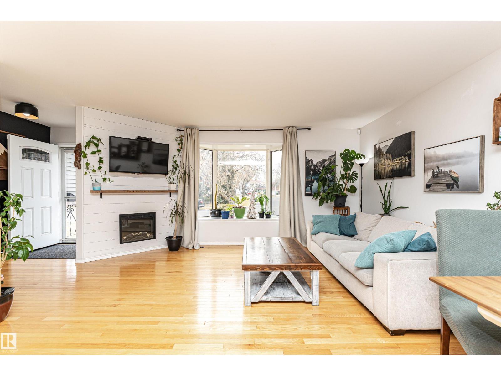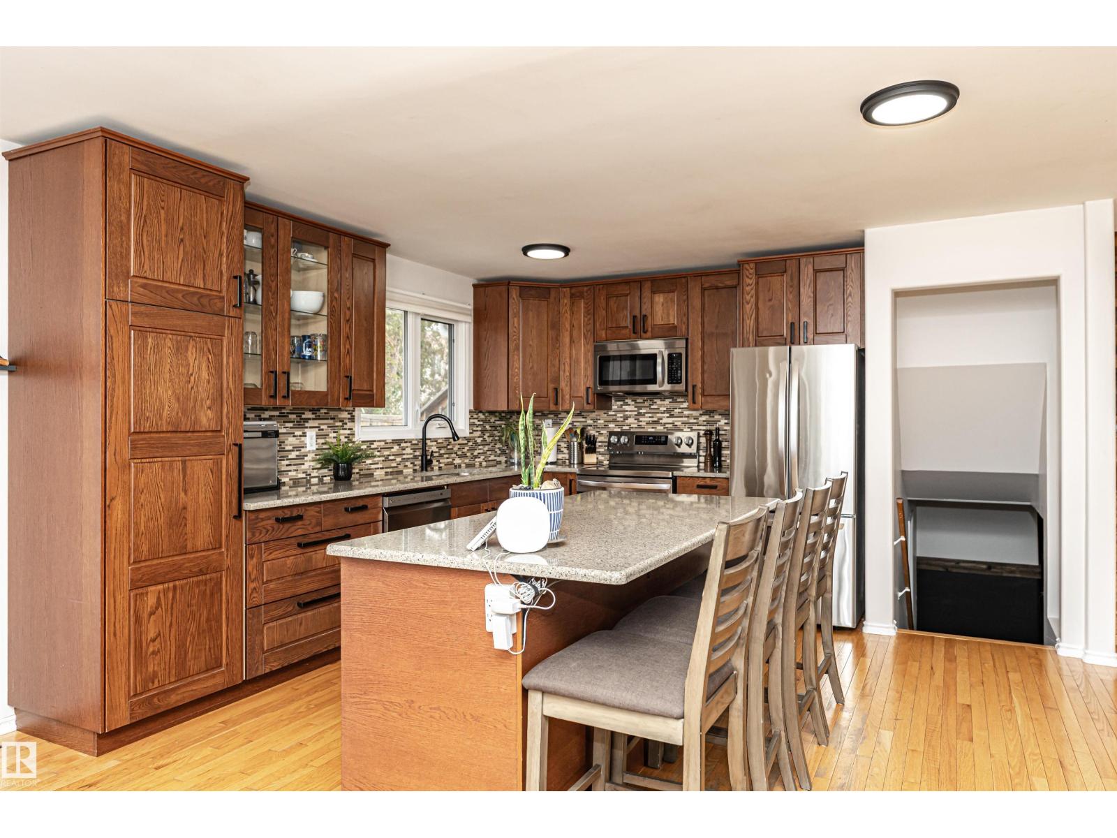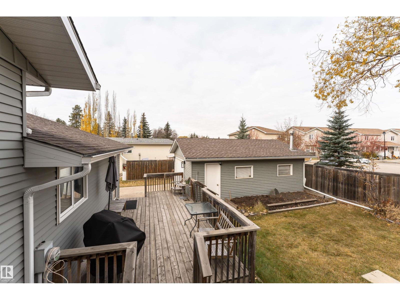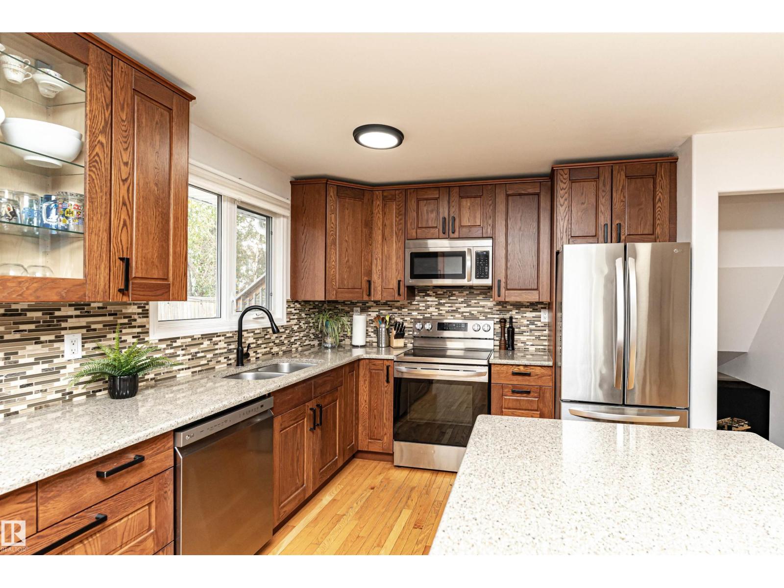 Quietly nestled on a peaceful cul-de-sac in Akinsdale, this fully RENOVATED 4-level split boasts STUNNING curb appeal & thoughtful modern updates throughout. The bright main floor features a cozy electric fireplace, BAY window, OAK hardwood floors & a CHEF-inspired kitchen W/a huge island, QAURTZ countertops, MOSAIC backsplash, soft-close cabinets W/modern hardware, OVERSIZED uppers, SS appliances & abundant storage—perfect for family living or entertaining. Upstairs, the primary suite offers double French doors leading to a private deck surrounded by mature trees, a 3-pc ensuite, plus two spacious bedrooms & an updated main bath. The first lower level includes a fourth bedroom & a 3-pc bath, while the lowest level highlights a SOUNDPROOFED media room & tidy laundry area. Outside, enjoy a private landscaped yard W/NEW fascia, soffit, gutters & downspouts, an OVERSIZED detached single garage & A/C for year-round comfort. Ideally located near schools, parks & trails this MOVE IN ready home truly has it all! (id:42720)