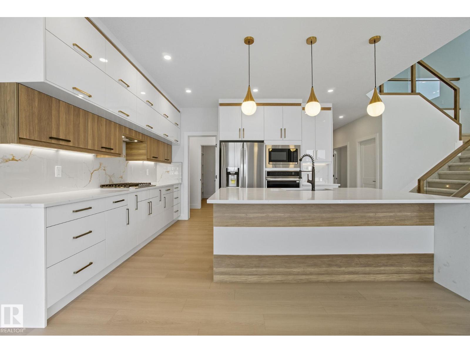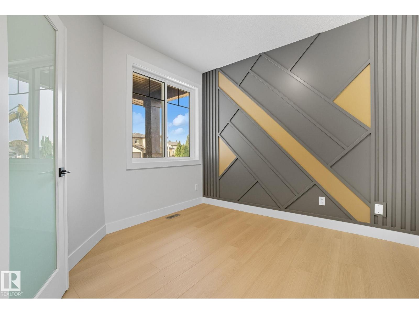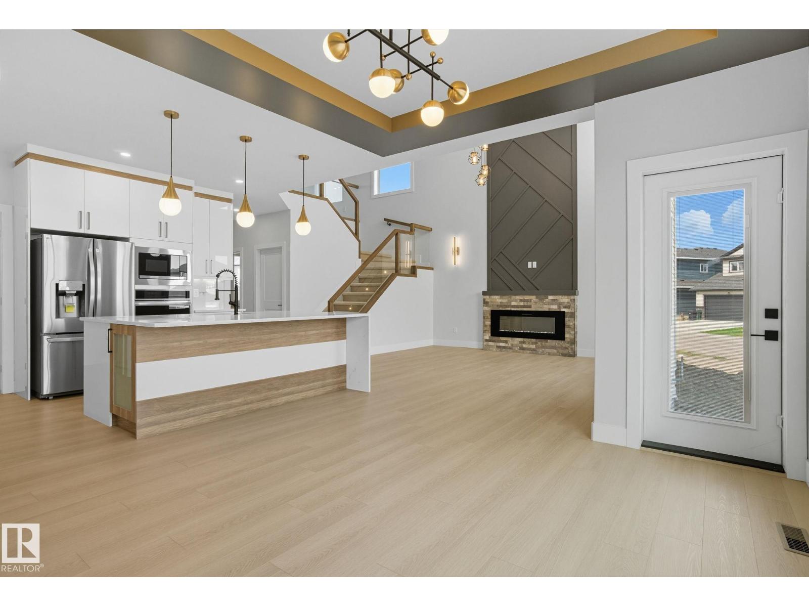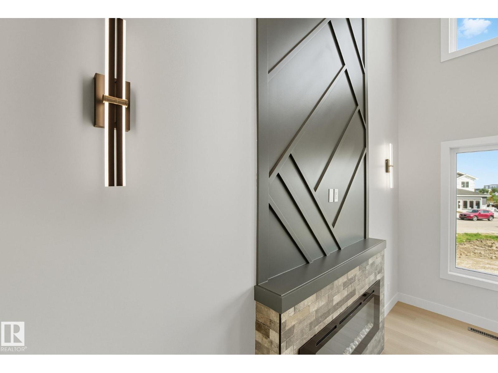 Built by Sunnyview Homes. 4 bedrooms and 3 full bathrooms. TRIPLE car garage w/huge driveway. This stunning home offers a main floor bedroom and full bathroom. The spacious open to below great room features a beautiful accent wall with electric fireplace. The upgraded kitchen boasts sleek ceiling height cabinetry, a walkthrough pantry and a nook with a built-in beverage station. The mudroom offers double coat closets w/a built in bench. A glass railing staircase with maple handrail and step lighting leads to the upper level central bonus room. The primary suite showcases a coffered ceiling and barn door entry to a spa like en-suite with double vanity, jacuzzi, custom glass-enclosed shower, and a WIC with MDF shelving. 2 additional bedrooms share a 4-piece bathroom. Finished with modern upgrades and quality craftsmanship throughout. Features, 3 gas lines, quartz, designer lighting pkg, plush carpet, accent walls, garage w/drain and hot/cold water lines. SEPARATE side entrance to the basement. (id:42720)