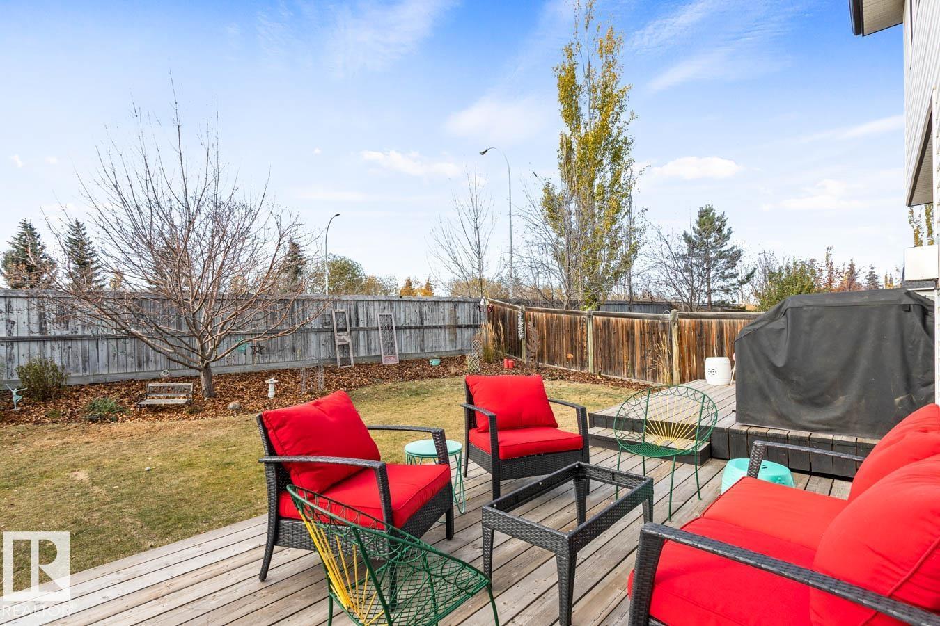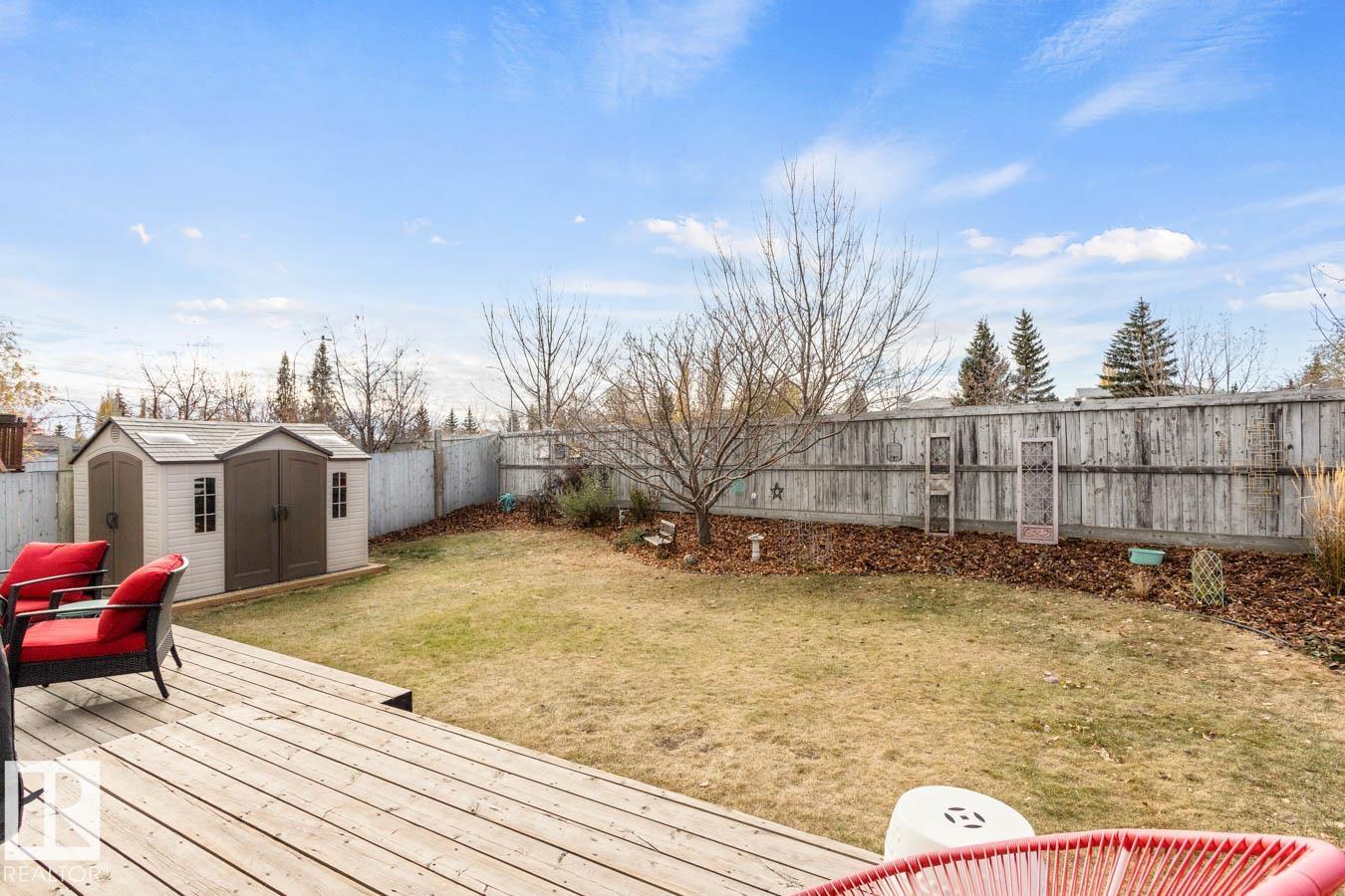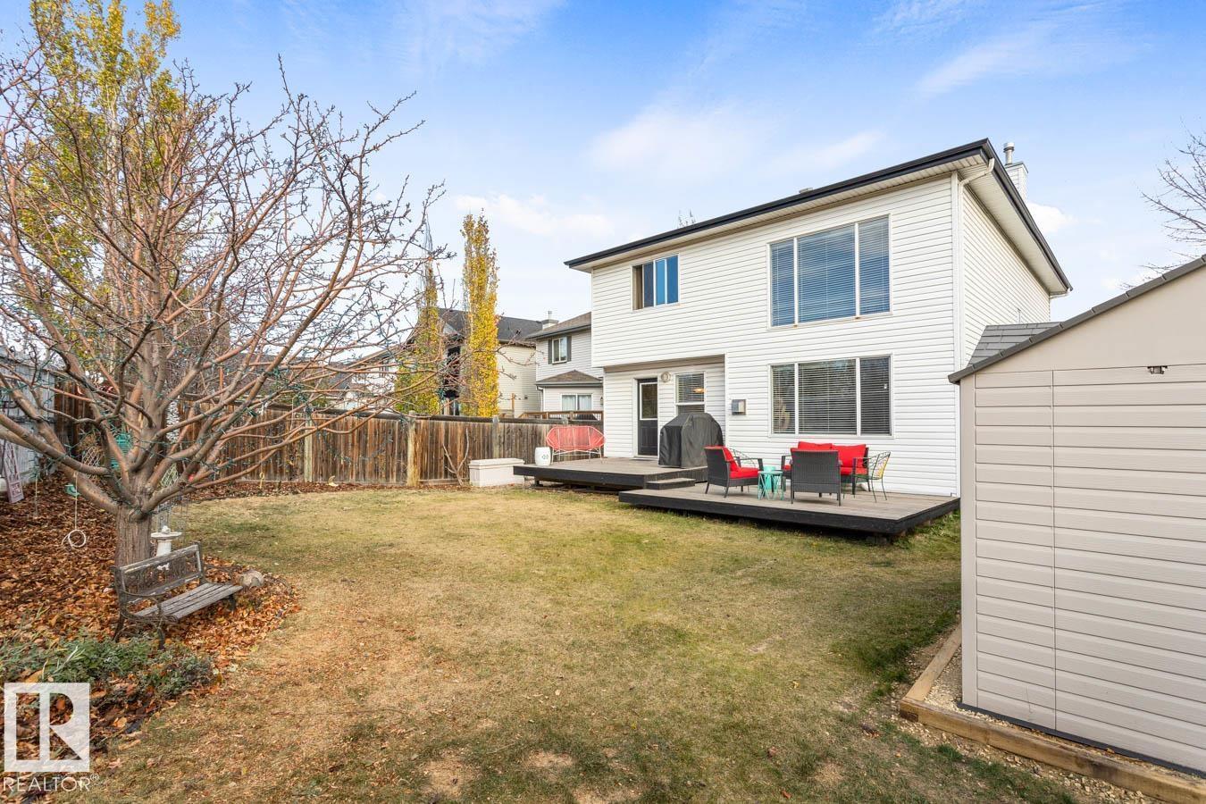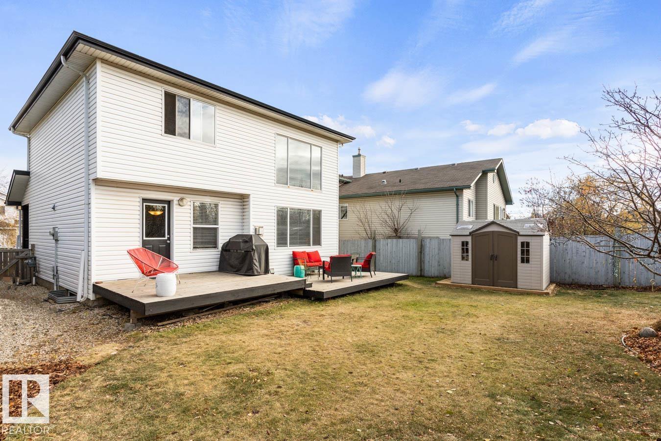 Located in the desirable community of Heritage Hills, this well-maintained home offers 3 bedrooms, 2.5 baths, and a NEW ROOF. Step inside to a bright, functional floor plan featuring luxury vinyl plank flooring and an abundance of natural light. The kitchen showcases plenty of white cabinetry, stainless steel appliances, a corner pantry, and island overlooking the dining area with cozy fireplace and a family-sized living room with soaring two-storey ceilings. Upstairs, the king-sized primary suite features dual closets and a private ensuite. Two additional generous bedrooms, a 4-pc main bath, and convenient upper-floor laundry complete the level. The unfinished basement provides excellent potential for a rec room or additional bedrooms & bathroom with RI plumbing. Enjoy the west-facing, fully fenced and landscaped yard with entertaining-sized deck and storage shed. Fantastic location close to parks, schools, Heritage Hills Dog Park, wetlands trails, and all amenities. (id:42720)