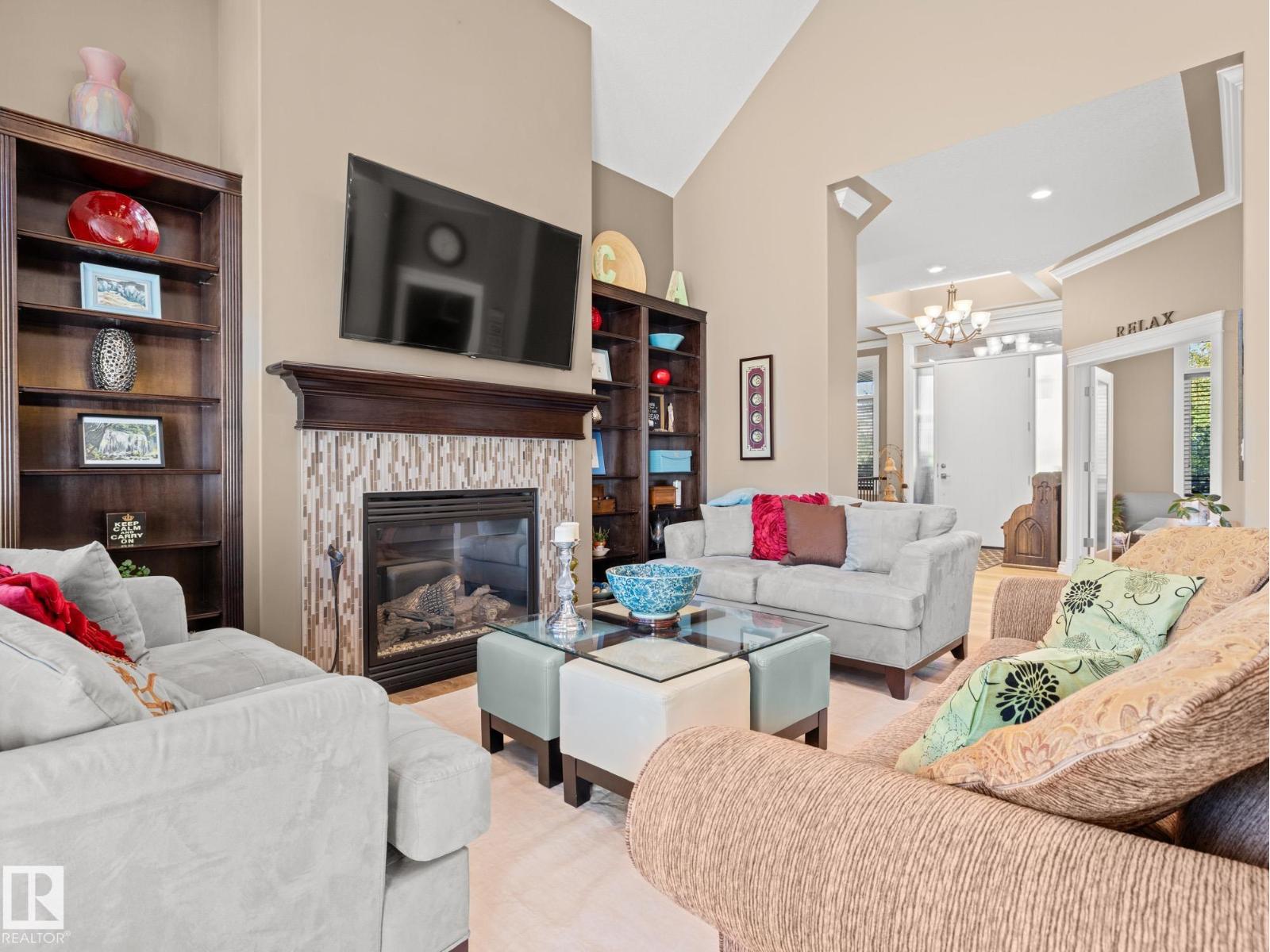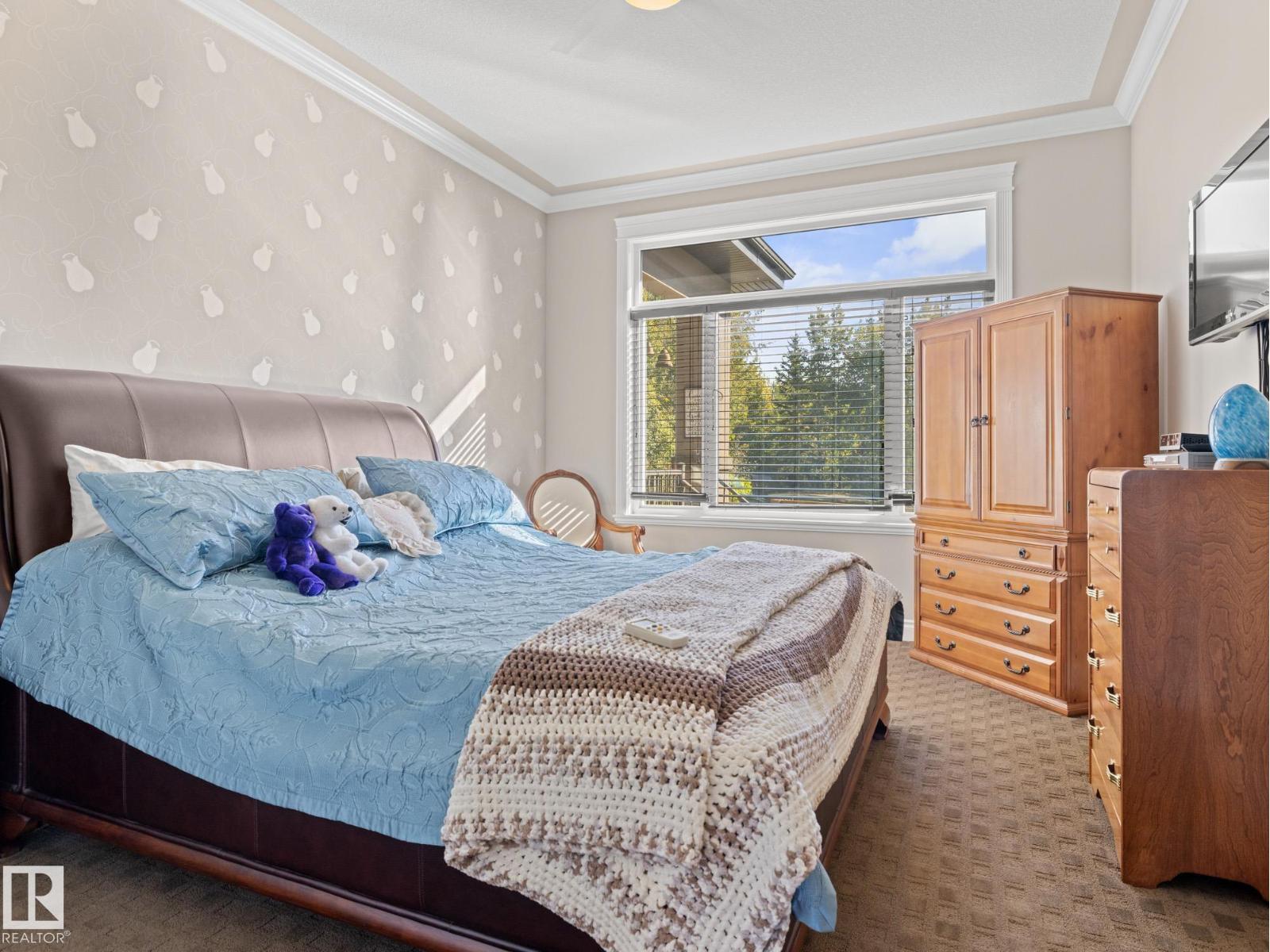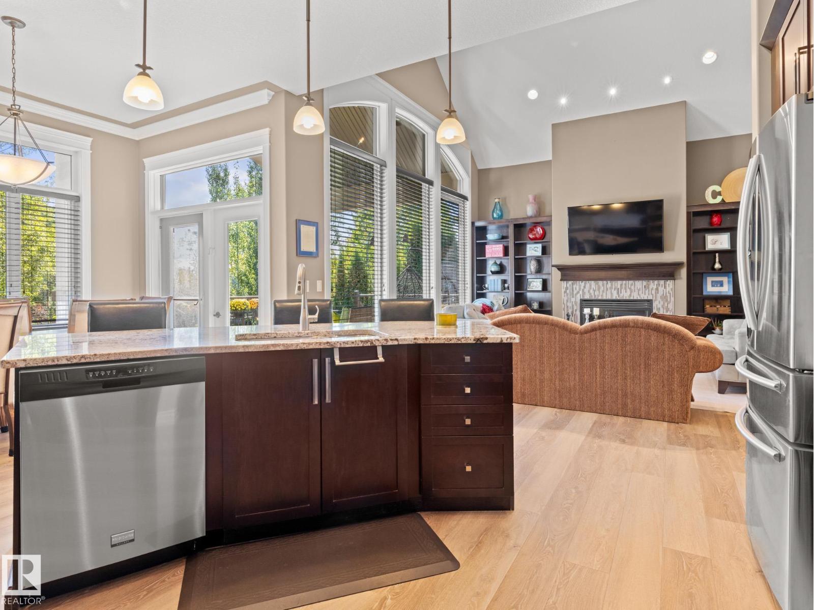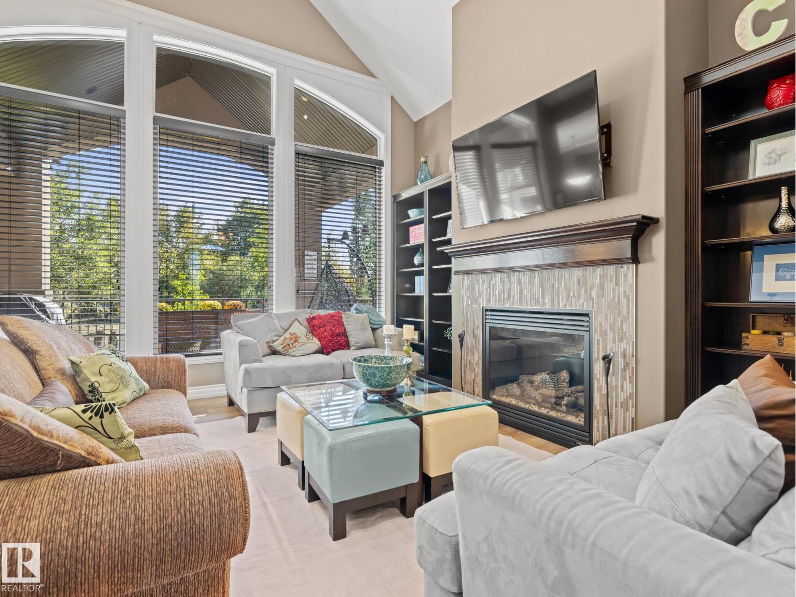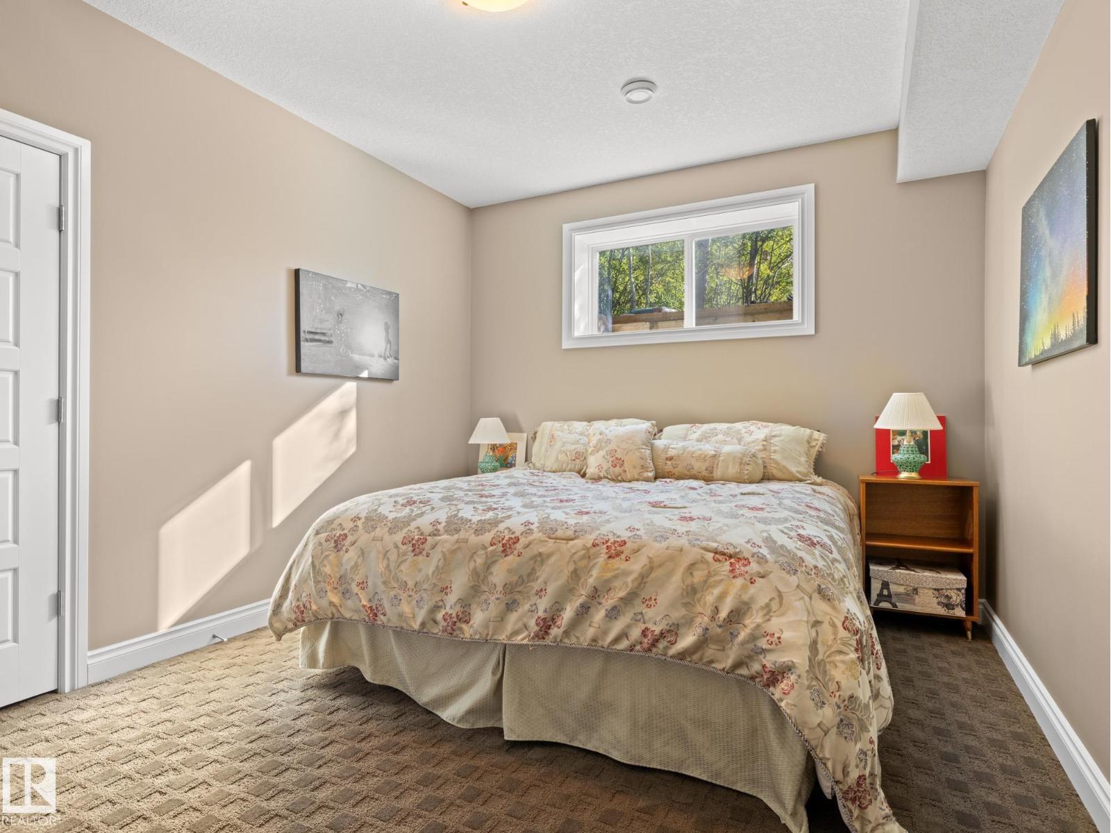 Stunning Luxury Half-Duplex Bungalow in Gated Community! This unit offers the LARGEST floorplan with just under 1900sqft above grade. Just 5 minutes from Spruce Grove, this executive home offers the perfect blend of privacy, convenience, and upscale living. Backing onto a serene pond with pathways exclusive to the community, you’ll enjoy peaceful views right from your backyard. The main floor boasts 10 ft ceilings, BRAND NEW VINYL PLANK FLOORING, a bright living room with fireplace, and a gourmet kitchen featuring a large island and separate dining area—ideal for entertaining. Two massive bedrooms, two full bathrooms and a large den that can be used for office space, complete the main floor. The fully finished basement offers even more living space with two additional bedrooms, a full bathroom, a recreation area, and another cozy fireplace. Step outside to a beautifully landscaped yard with a deck that overlooks a tranquil treed backdrop. NEW FURNACE, A/C, SHED IN THE BACK, and so much more!! (id:42720)